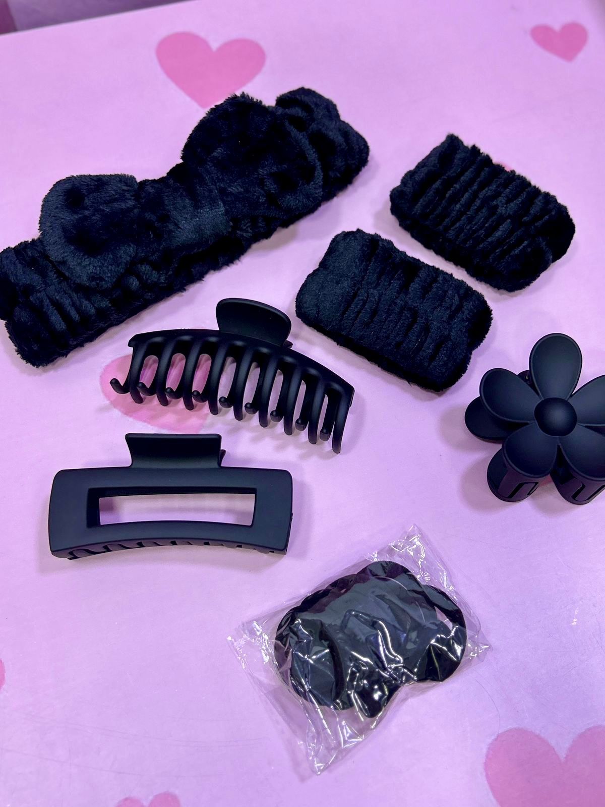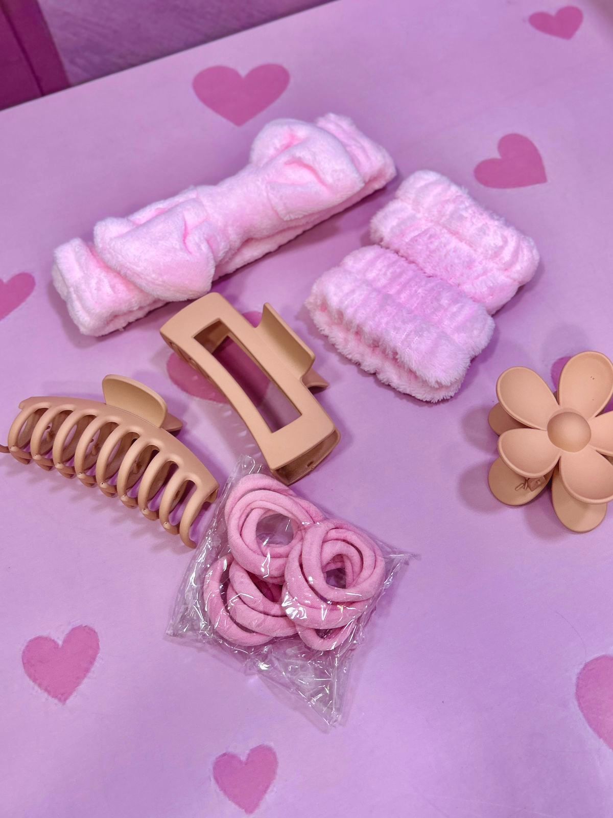 Este encantador kit de cuidado personal tiene todo lo que necesitas para consentirte mientras cuidas tu piel con estilo: incluye 3 pinzas grandes, 1 balaca suave tipo spa, 2 muñequitas absorbentes para la limpieza facial y 10 chulitos para dar un toque cute a tu peinado. Perfecto para rutinas de skincare, maquillaje o momentos de relajación, todo en colores delicados que te harán sentir como en un verdadero salón de belleza en casa.