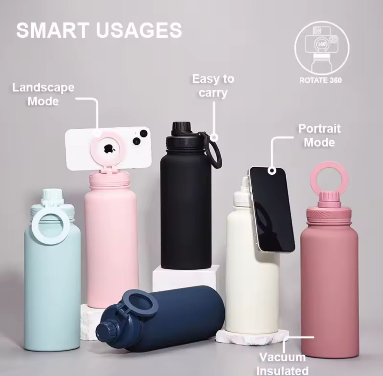 El termo más viral del momento ha llegado para revolucionar tu rutina: con diseño térmico de 1000ml, base de silicona para máxima estabilidad y un poderoso imán magnético que convierte la tapa en un soporte para tu celular. Compatible con iPhone y Android, te permite grabar, ver contenido o tomar fotos con total comodidad, sin dañar tu dispositivo. ¡Hidratación con estilo y tecnología en un solo producto!